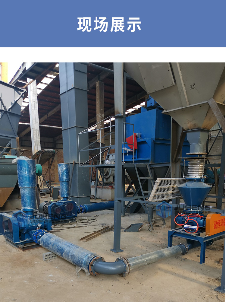負(fù)壓系統(tǒng)介紹:利用輸送系統(tǒng)終點的真空泵抽吸系統(tǒng)內(nèi)的空氣,輸送管內(nèi)形成低于大氣壓的負(fù)壓氣流,物料同大氣一起從起點吸嘴進入管道,隨著氣流輸送到終點分離器內(nèi),物料受到重力或離心力作用從氣流中分離出來,真空泵正壓將物料送到目的倉。